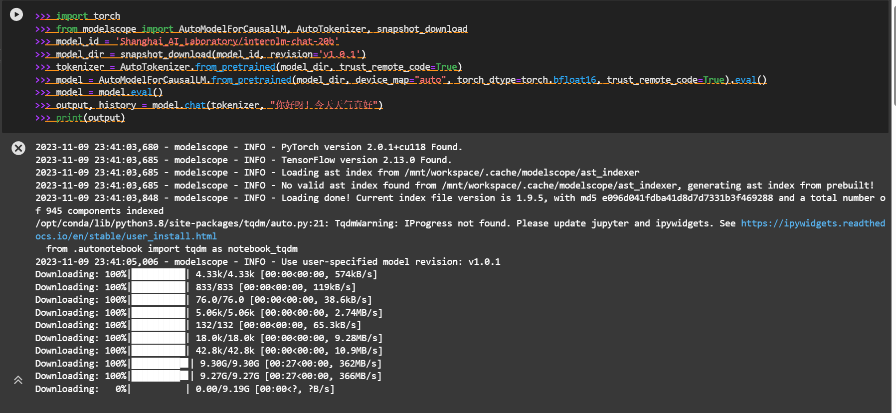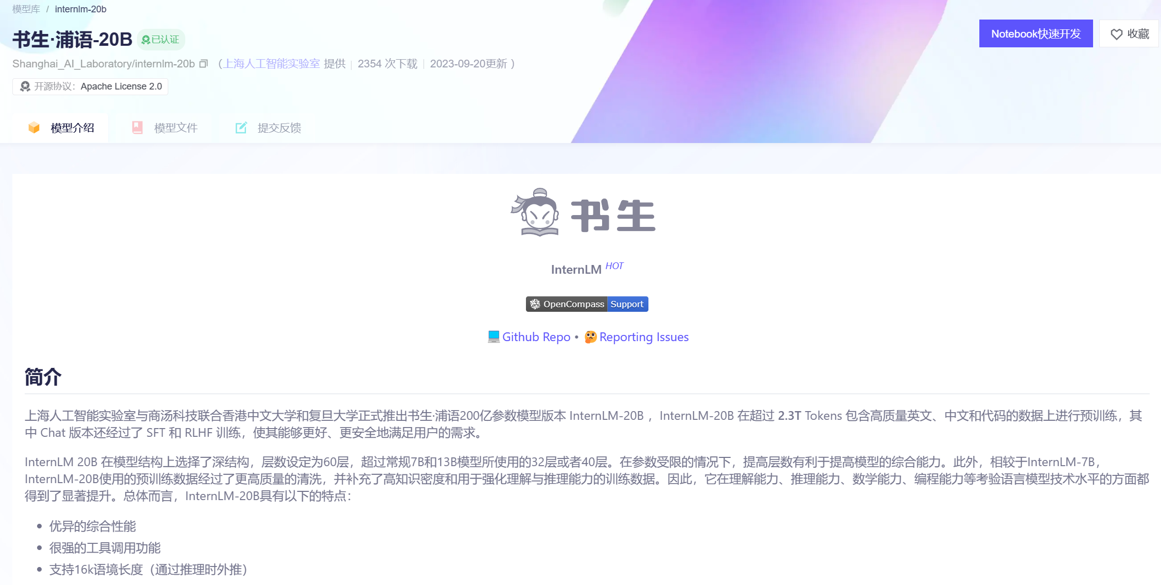 第四步:返回介绍页面,复制执行的代码加载 InternLM 20B 模型