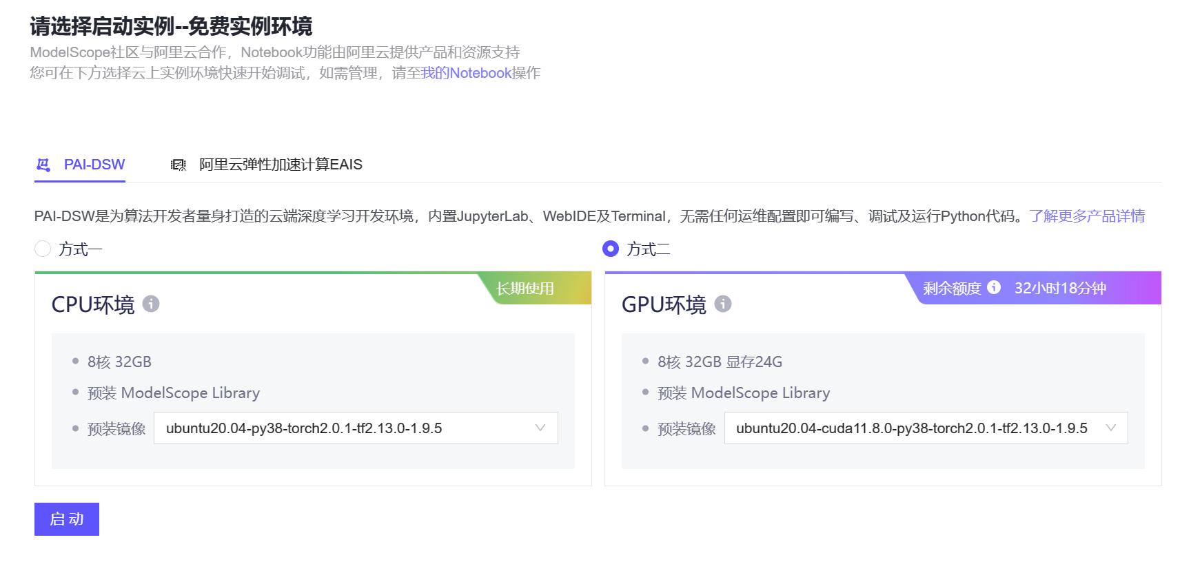 - 点击右上角的Notebook快速开发按钮,我们选择方式二:GPU环境,这是免费配置里面最顶的一台配置了,选择完之后启动。启动会弹出新的页面,新的页面里用阿里的账号登录一下即可进入实例终端执行页面。