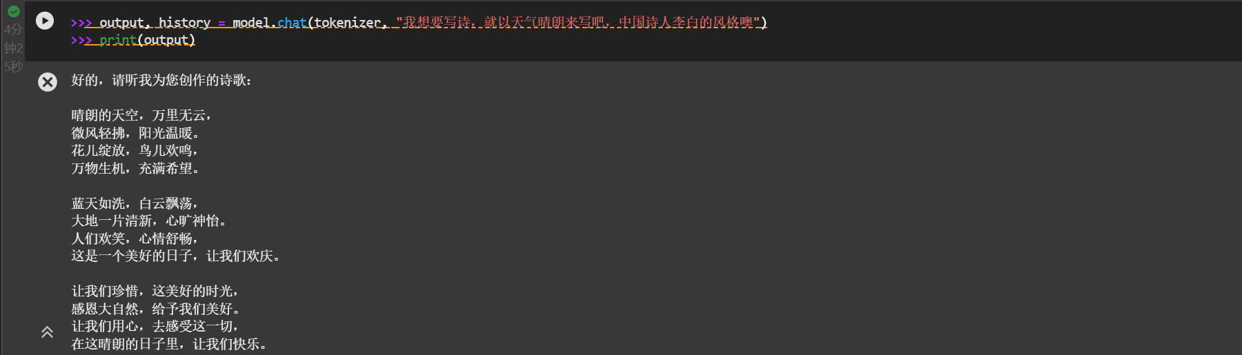 - 模型已经执行回答我们的问题:“我想要写诗,就以天气晴朗来写吧,中国诗人李白的风格噢”,大模型回答这个问题花了4分25秒钟,回答的内容是:好的,请听我为您创作的诗歌: