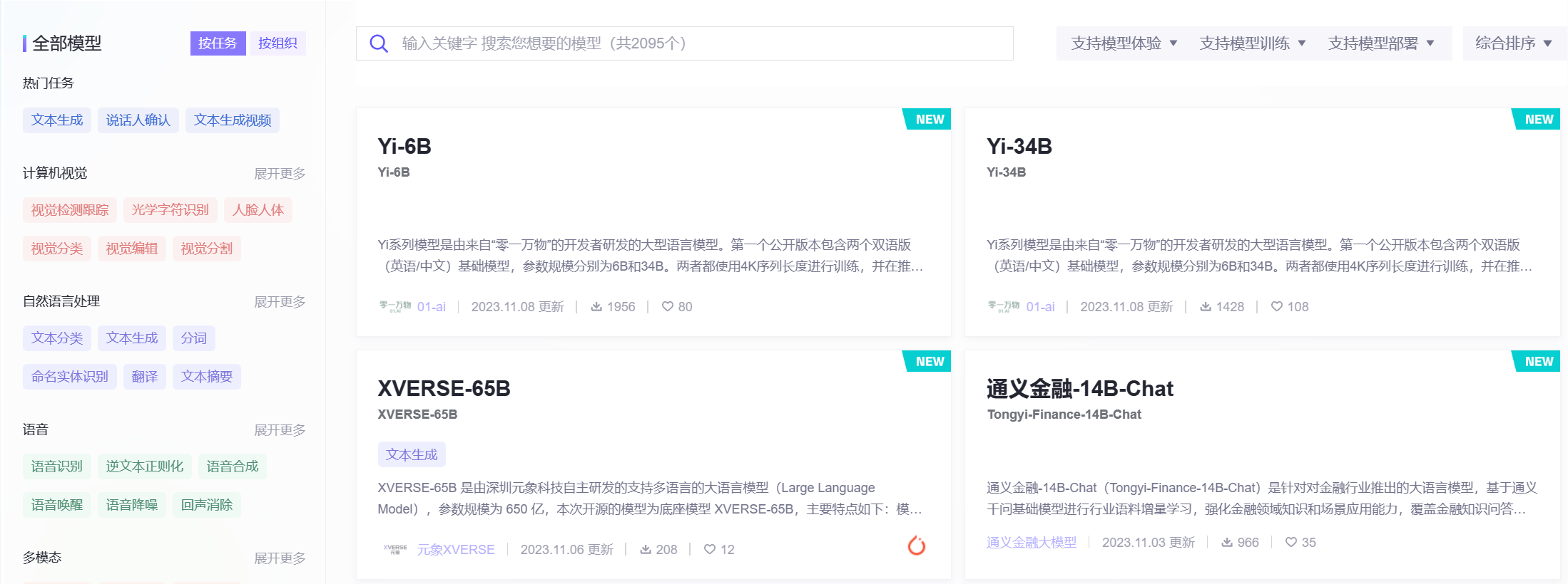 - 魔搭社区是一个致力于中文AI模型开源的平台,目前已经拥有超过2095 款开源模型 (截至日期:2023.11.10)。在这里,你可以找到各种实用且多样化的AI模型,让你可以根据自己的需求进行选择。通过使用魔搭社区提供的Notebook,你能够快速体验和开发你感兴趣的模型,为你的AI探索之旅增添更多乐趣。这个平台将有助于你更好地体验和了解AI技术的应用,为你的创意和学习提供更多可能性。