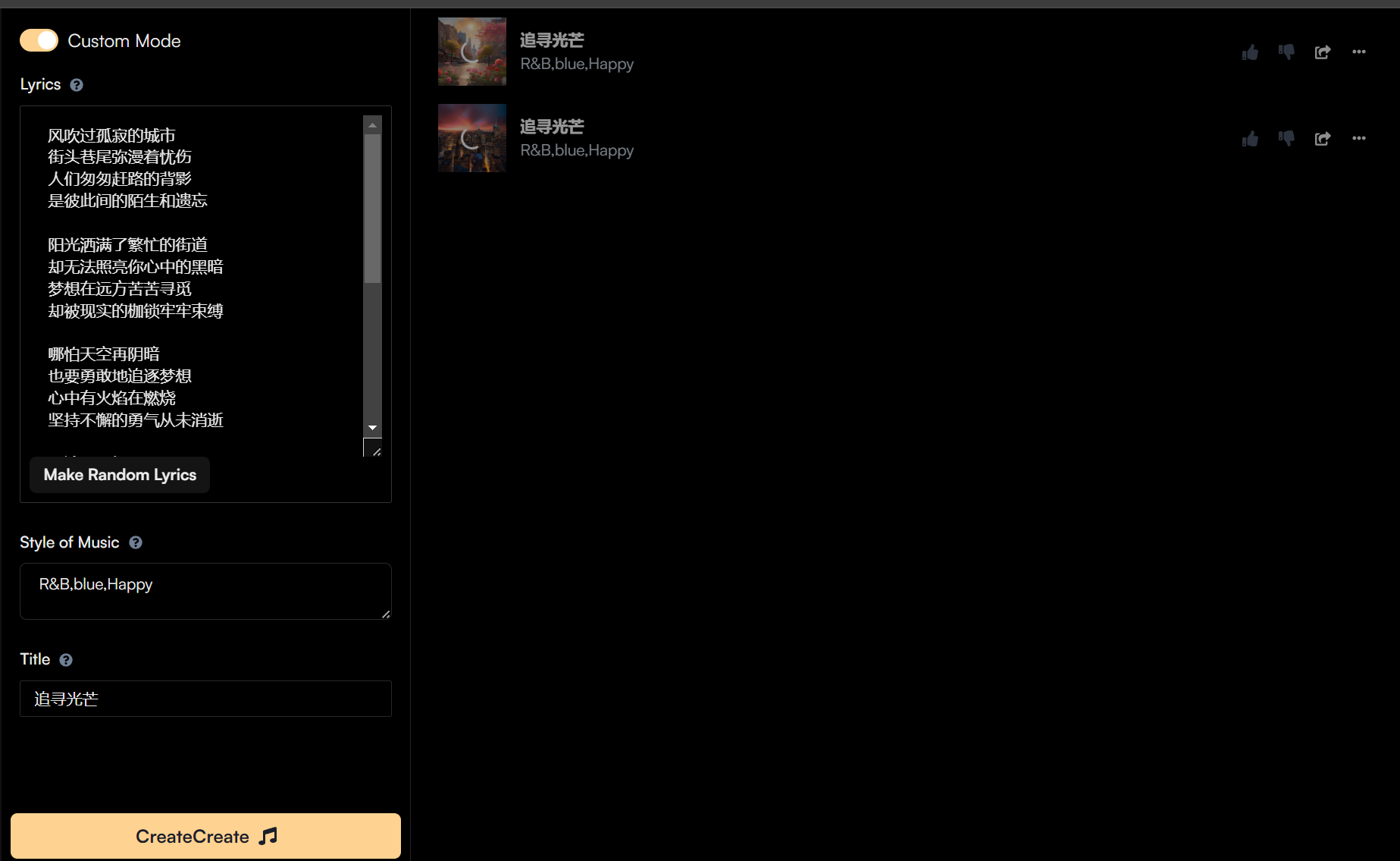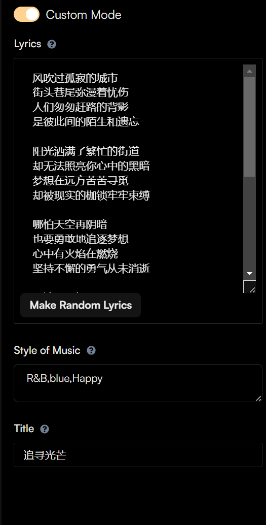 - 在Suno.ai的主界面中,选择你想要的音乐风格和情感。(我选择R&B风格,情感为Happy。歌词使用chatGPT生成,方文山风格的歌词,标题名字为《追寻光芒》)